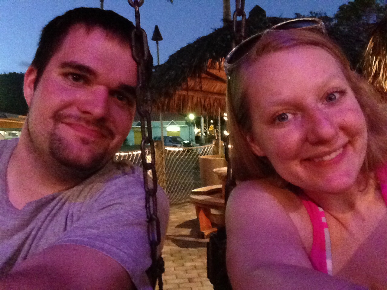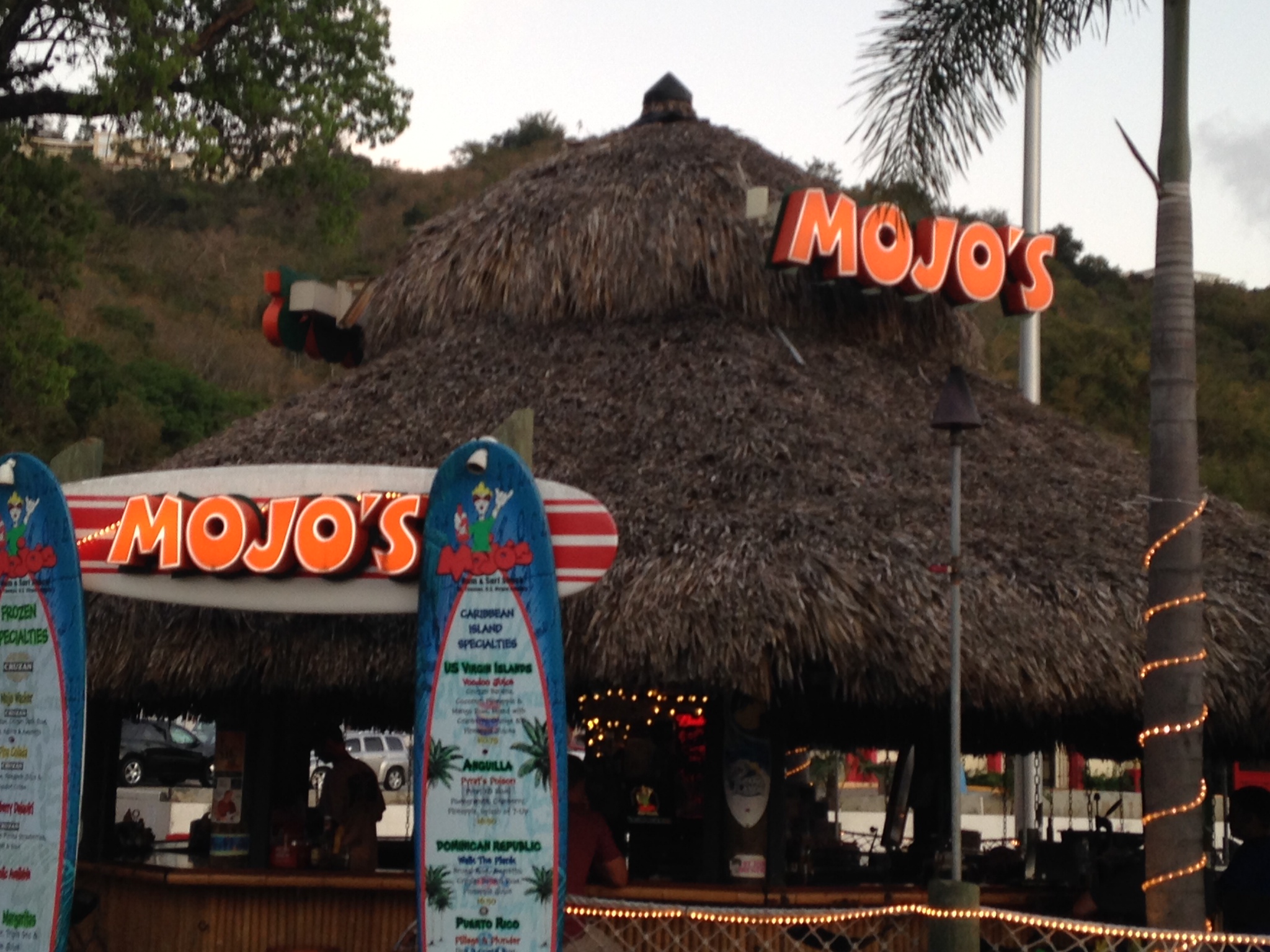 We are exhausted by this point, but know we have to get something to eat. When we were on St. Thomas in December for our cruise, we ate a this little tiki hut bar called Mojo’s, located in the Havensight district (near the cruise ship docks). Our friend Josh had told us about this place, and we loved it, so we decided to make our first meal on the island a return to Mojo’s. They have great roasted chicken, and of course, frozen drinks!