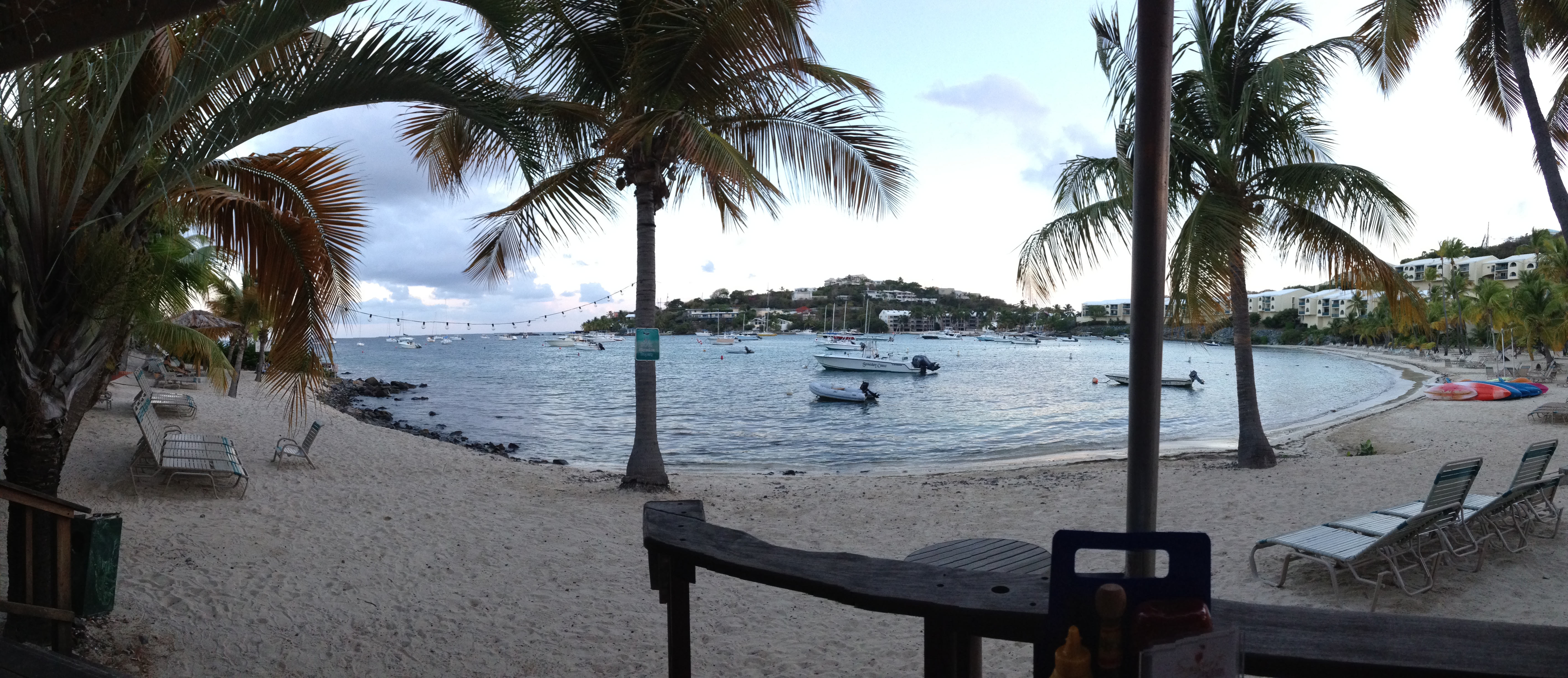 It was a long day of driving, searching and by the time dinnertime came around, I was in no mood to cook. I had originally wanted to take Dan out for dinner tomorrow night to celebrate his first day of work, but we decided to go out tonight anyway. We headed to the eastern end of the island, to a restaurant called Sangria’s. It’s located on Cowpet Bay, as part of the Elysian Beach Resort. It was a pretty quiet night, but the view was fantastic. Nice way to wind down being “tourists” for a couple of days before Dan starts work tomorrow.