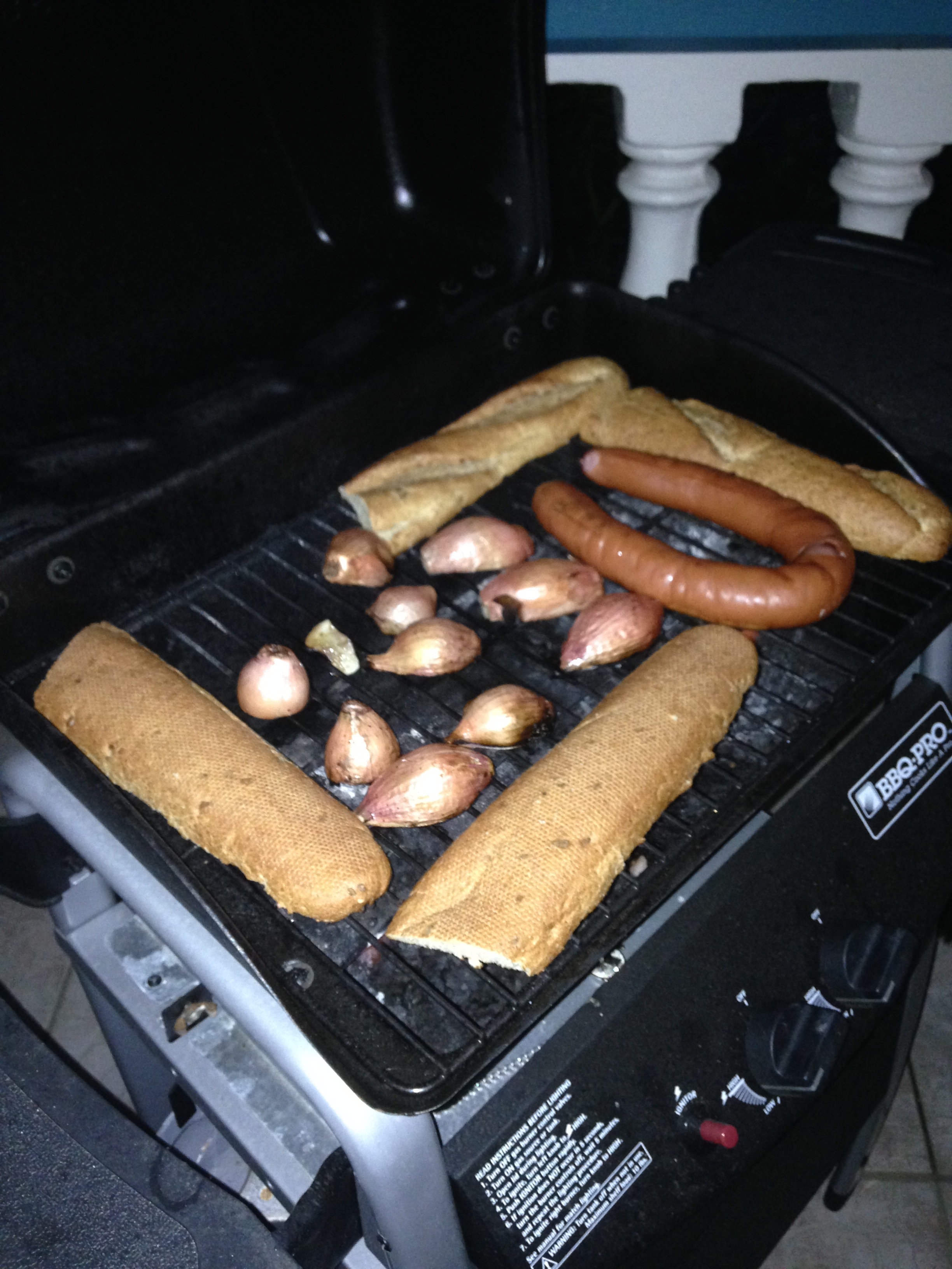 Shallots, sausage and French bread on the grill. Add in some chicken that our guests brought and we had a tasty meal!