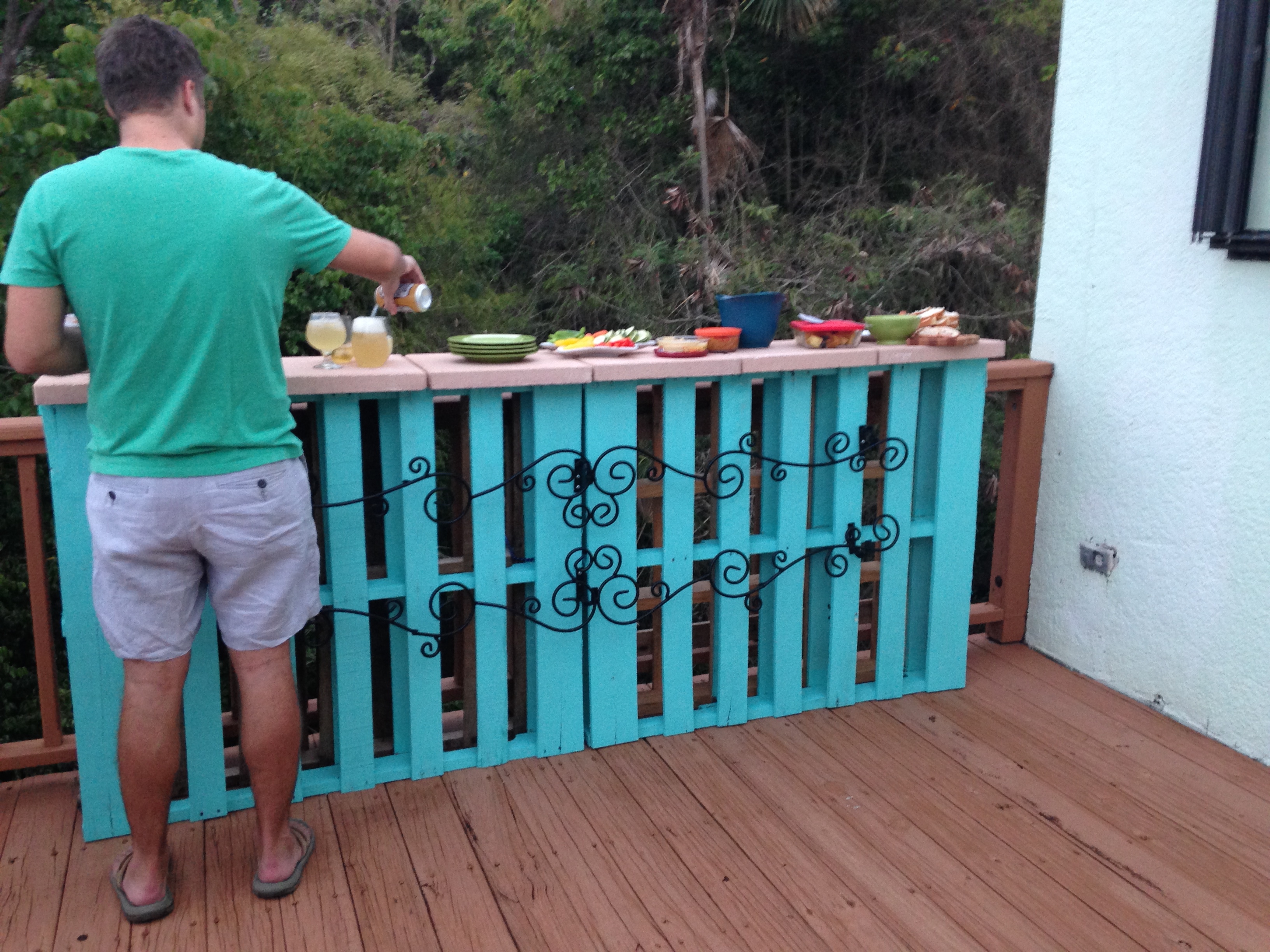 I talked about tropical weather a bit last week, but this weekend we had our first Caribbean weather “incident”. Tropical Storm Bertha was slated to pass by the USVI on Saturday, so of course Friday evening was spent at a preparatory event: cocktails with A & M. They have a super sweet deck overlooking Magen’s Bay, and have DIY’ed themselves a bar made of pallets and cement pavers. It turned out awesome, and the yummy spread was even better. The cocktail was a Dark & Stormy, very appropriate for the oncoming weather, and was delicious. M will have to tell me if I got the recipe right, but it goes something like this: