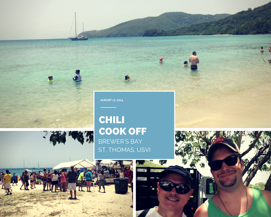 On Sunday we attended the 17th annual Texas Society of the Virgin Islands Chili Cook Off in Brewer’s Bay. The Gilberts got their first taste of USVI beach heat because it was HOT. Not much shade at Brewer’s Bay, either. We had fun visiting some of the more than 80 different competitor booths and sampling lots of chili. The highlight of the afternoon was making frequent trips to stand in the water. Holy hotness. After the chili cook off we headed up the mountain to aptly named: Mountain Top. This kitschy spot is a souvenir-hunter’s paradise, attached to a bar that makes killer banana daiquiris all with a fantastic view.
