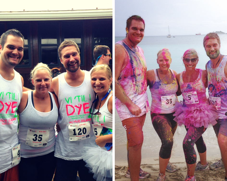 This weekend we ran in the VI ‘Til I DYE color run with some friends. We had a blast, and got completely covered in color. The run ended at the beach, and the water turned pink and purple as people ran into the ocean. Don’t worry, eco-friends. The dye is simply cornstarch and is completely biodegradable. And only in the VI would you pause a race to play a game of flip cup. Best. Race. Ever.