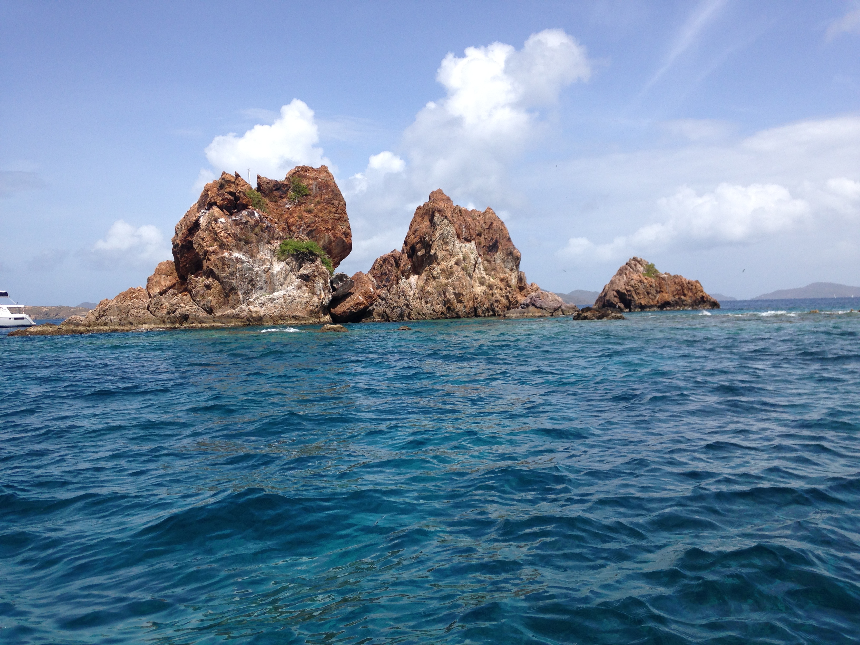 After swimming to the other side of the rocks, the water was nearly 60 feet deep and we saw some beautiful fish and coral on the sheer face of the rocks. As we swam back to the boat, Kevin and my parents were tossing pretzels into the water and we were swarmed with fish.