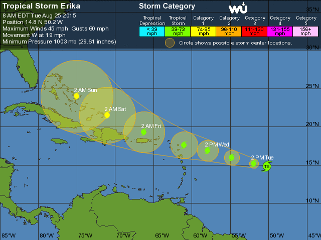 We got about a half inch of rain overnight, but otherwise don’t think Danny will produce much for the VI. The storm fell apart pretty quickly once it hit some dry air and dumped some rain on St. Croix 45 miles to the south of us. There is another developed storm, Tropical Storm Erika, headed our way this week as well. At this point it’s tracking a little more directly over us, so we may see some more rain from this storm (fingers crossed).