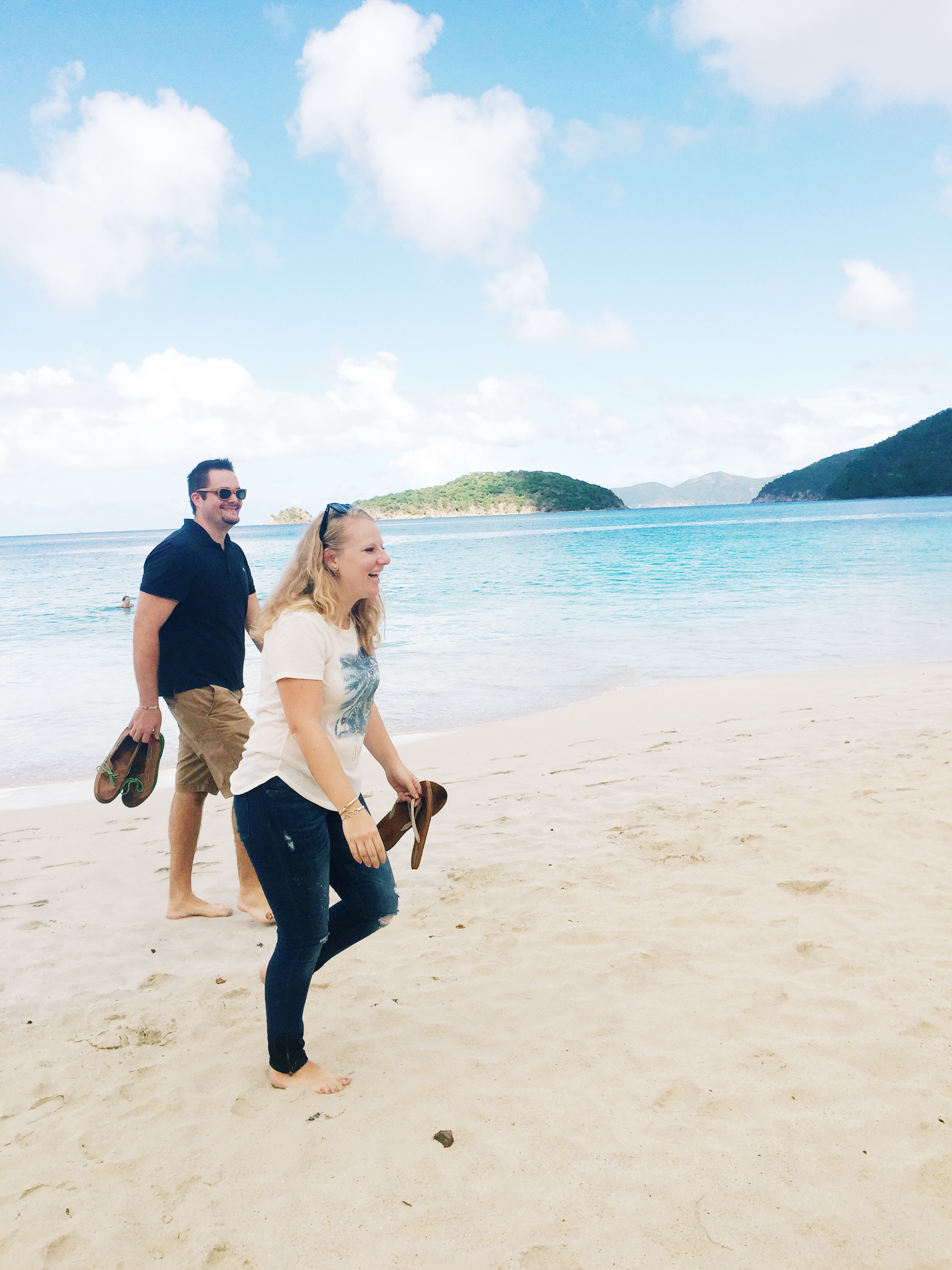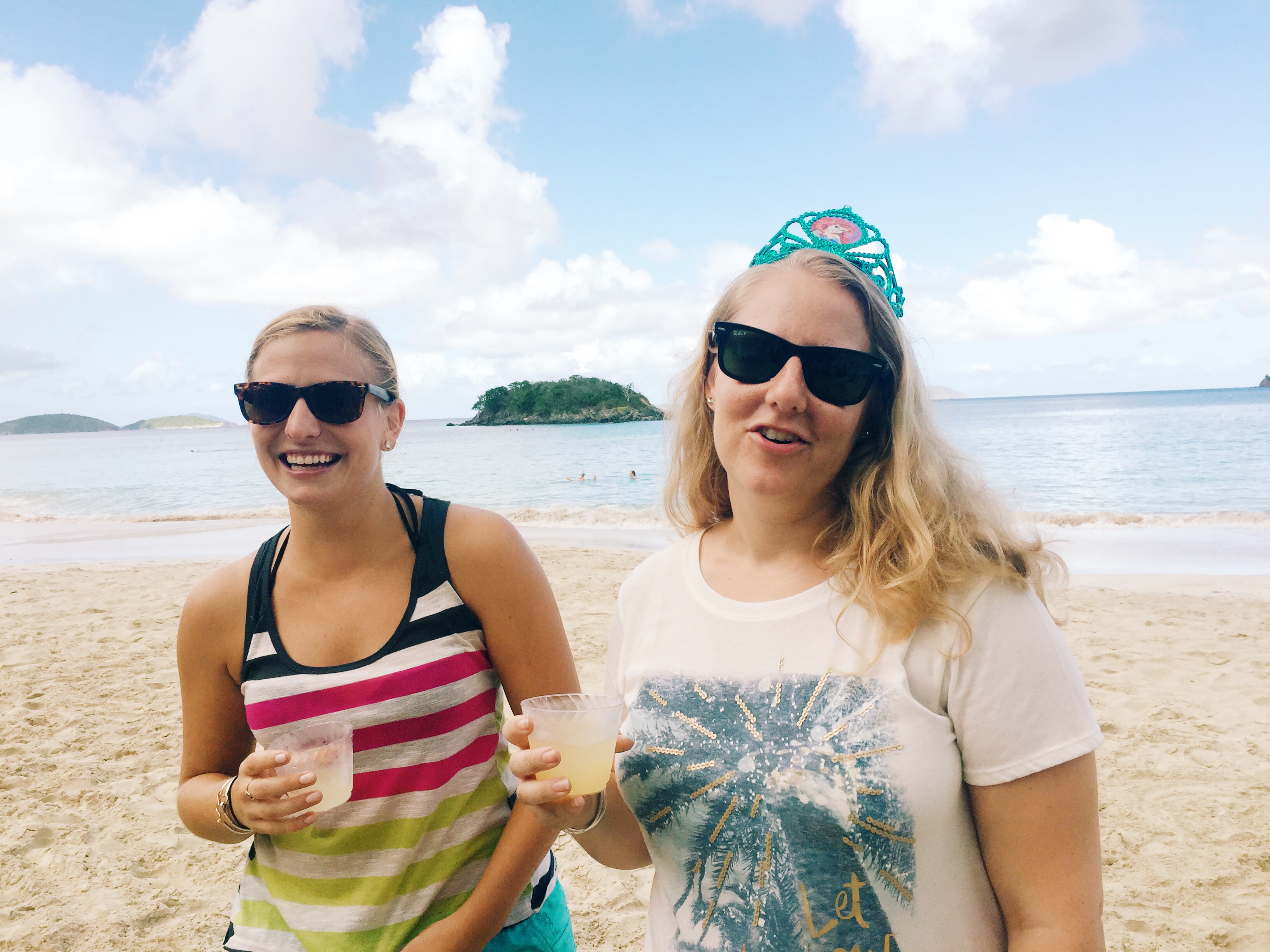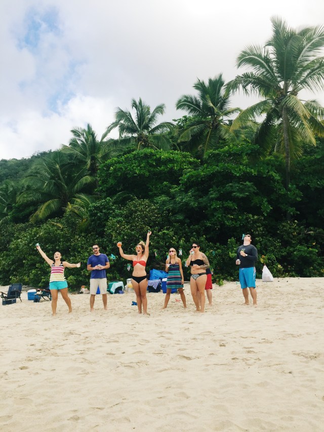 The following weekend I had asked our friend Tamara to take some photos for our holiday cards. Her point of view is super cool, check out her blog Southern Grade and you’ll be blown away by her talent! Dan had told me not to make other plans that day because he really wanted to have a beach day. Tamara convinced me to go to St. John to take pictures, so I figured we’d just spend the rest of the day there on the beach. That morning, though, Dan surprised me and said we were going to spend the night on St. John and go to dinner, hooray! I was very excited as I packed a quick overnight bag and we were scurrying out the door to meet Tamara to go to the car ferry. We took photos all throughout the Caneel Bay property and then she said we had one more stop at Cinnamon Bay. As we were walking down the beach to find our next “photo spot”, an unruly group of people came running out onto the beach with noisemakers and “30” signs. Surprise birthday beach party!? Yes please!