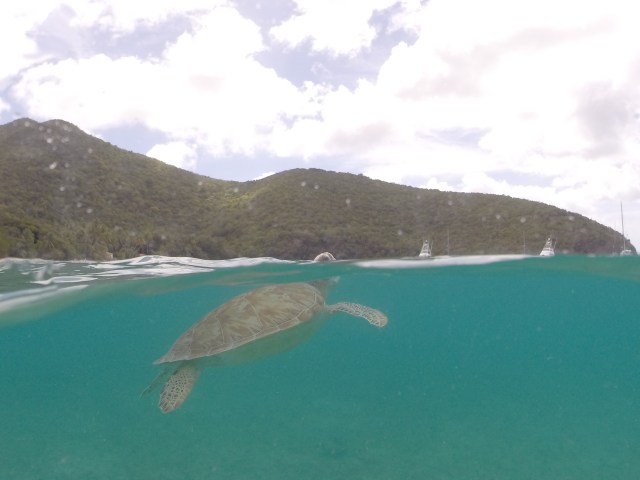 We had fun playing with our newest GoPro accessory, a dome attachment. It allows us to take photos that are half in the water, half out. This turtle made a great experimentation subject!